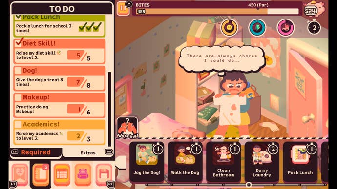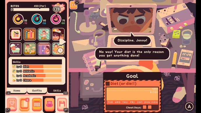 There's a lot of this kind of design elegance throughout Consume Me, where experiences - and even emotions - are conveyed as much through gameplay as story. That's most evident in its overarching framework of time management, where you'll need to use Jenny's limited free time as efficiently as possible in order to complete each chapter's checklist of objectives. Early on, her responsibilities - studying, chores, and sticking to her diet - seem manageable enough, but with only a few hours of free time available each day, staying on top of things quickly become a tricky (and stressful) balancing act. One wrong move can have a dramatic knock-on effect; overeat, for instance, and suddenly you'll need to spend a precious hour exercising to get back within your Bite limit. Then there's the added complexity of your ever-dwindling mood, energy, and guts meters, all requiring diligent maintenance in order to avoid locking yourself out of critical activities each day. You can probably see where this is going.