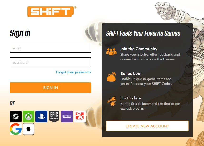 To redeem SHiFT codes, you first need to create a SHiFT account. You can do this by either using an email or a first-party platform account, such as PlayStation, Steam or Xbox. Creating a SHiFT account is free, and even if you're not planning on using the codes, you'll need one for online matchmaking and crossplay multiplayer.