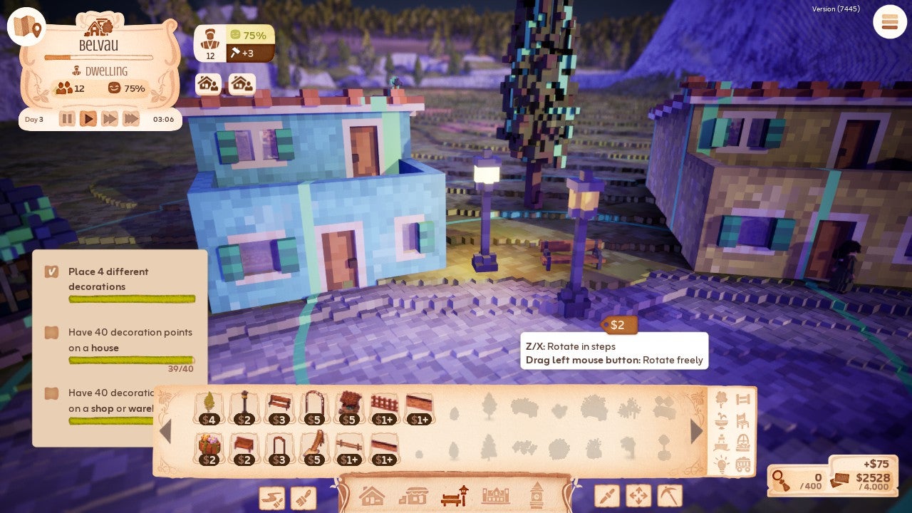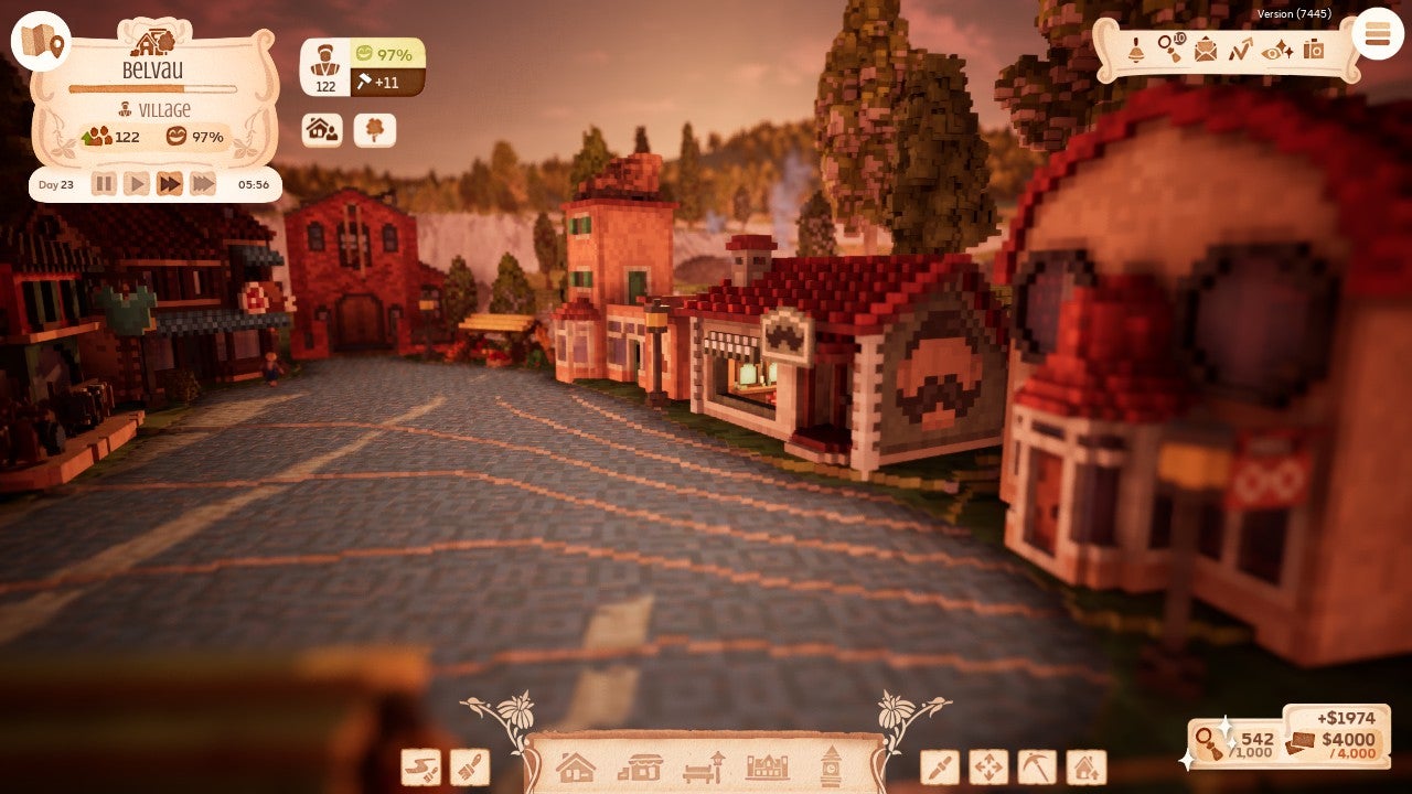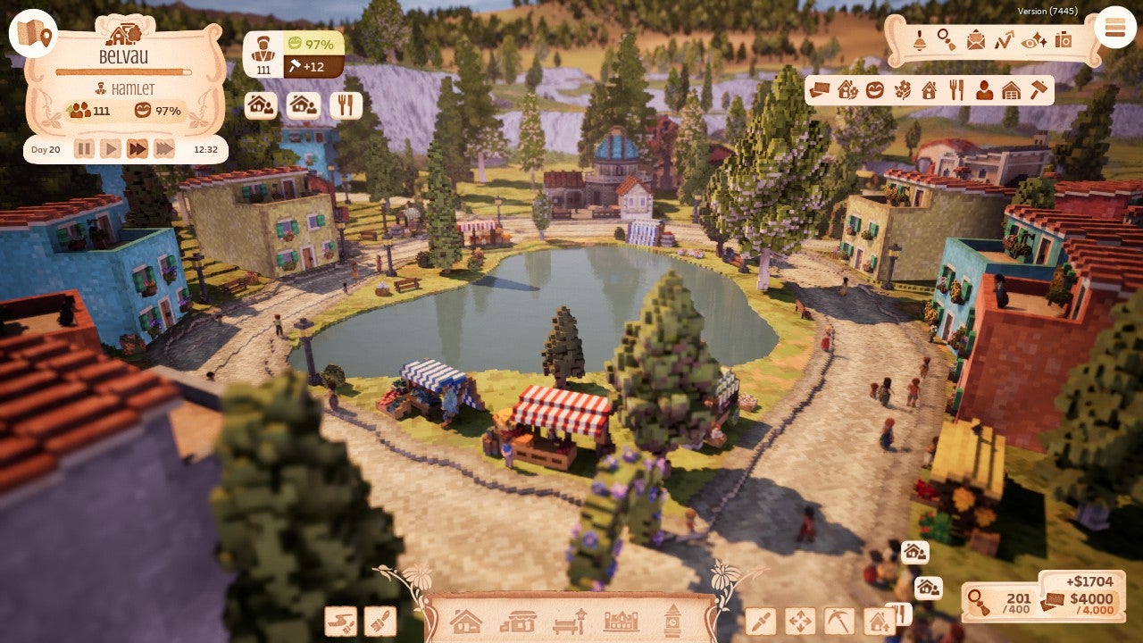 It's familiar stuff, and Town to City streamlines the formula down to the absolute essentials. There're a few wrinkles, mind, but these ultimately boil down to space management - don't expect to see anything like cross-border trade agreements or complex production chains here. Plop some buildings down to satisfy early demand - a couple of single-story houses, perhaps, or a vegetable stall - and it won't be long before you've built yourself into a corner, and the only way to continue catering to your citizens' ever-escalating whims is a town redesign. But that's fine! Really, design is what Town to City is all about. Think of it more as a beautification tool with a few simple progression knobs on, and its appeal is immediately clear.