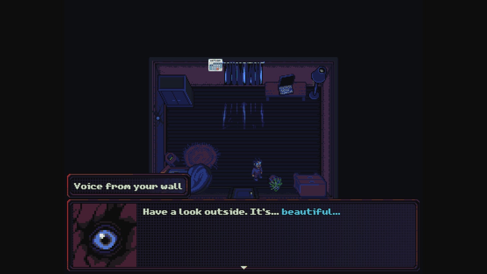 Look Outside starts as it means to go on, hinting at a choice and then standing back smirking. The room's dark; strange light leaks through closed curtains, and a beady eye poking through a crack in the wall urges you to peek out the window. You don't have to do it; it's not a formal decision point as such, just a gently presented possibility - and you can practically hear developer Francis Coulombe cackling as your curiosity wins out and all your innards explode through your eye holes.
