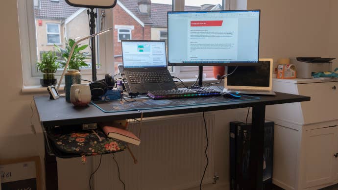 So once it's assembled, is it any good? It's definitely up there with some of the best standing desks I've tested in terms of looks and build quality, but there's a little bit of wobble when the desk is at its highest position. It doesn't feel unsafe or unsettling, by any means, but if you're typing with vigour then you can sometimes notice your screen trembling. The cable management area can also be a bit fidgety to open and close, requiring a few attempts to latch properly, but it provides a lot of space for multi-gang extension leads and power bricks which is nice. The soft touch finish and matte black colouring of the worktop is perhaps the Nevi's best feature; it's by far the best-looking standing desk I've seen and feels comfortable to use for typing or gaming.