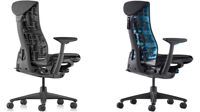 Standard gaming chairs tend to trade on their looks, and the Embody is pleasantly counter-culture in this regard. There are no oversized logos or primary colours here, and indeed nothing at all to identify the brand from the front. The colour scheme is neutral, dark matte grey with a few blue accents, and the chair's unique design is only really noticeable from the back. That suits me down to the ground, but some people may prefer a more obvious design they can show off on a Twitch livestream in exchange for their £1495 investment.