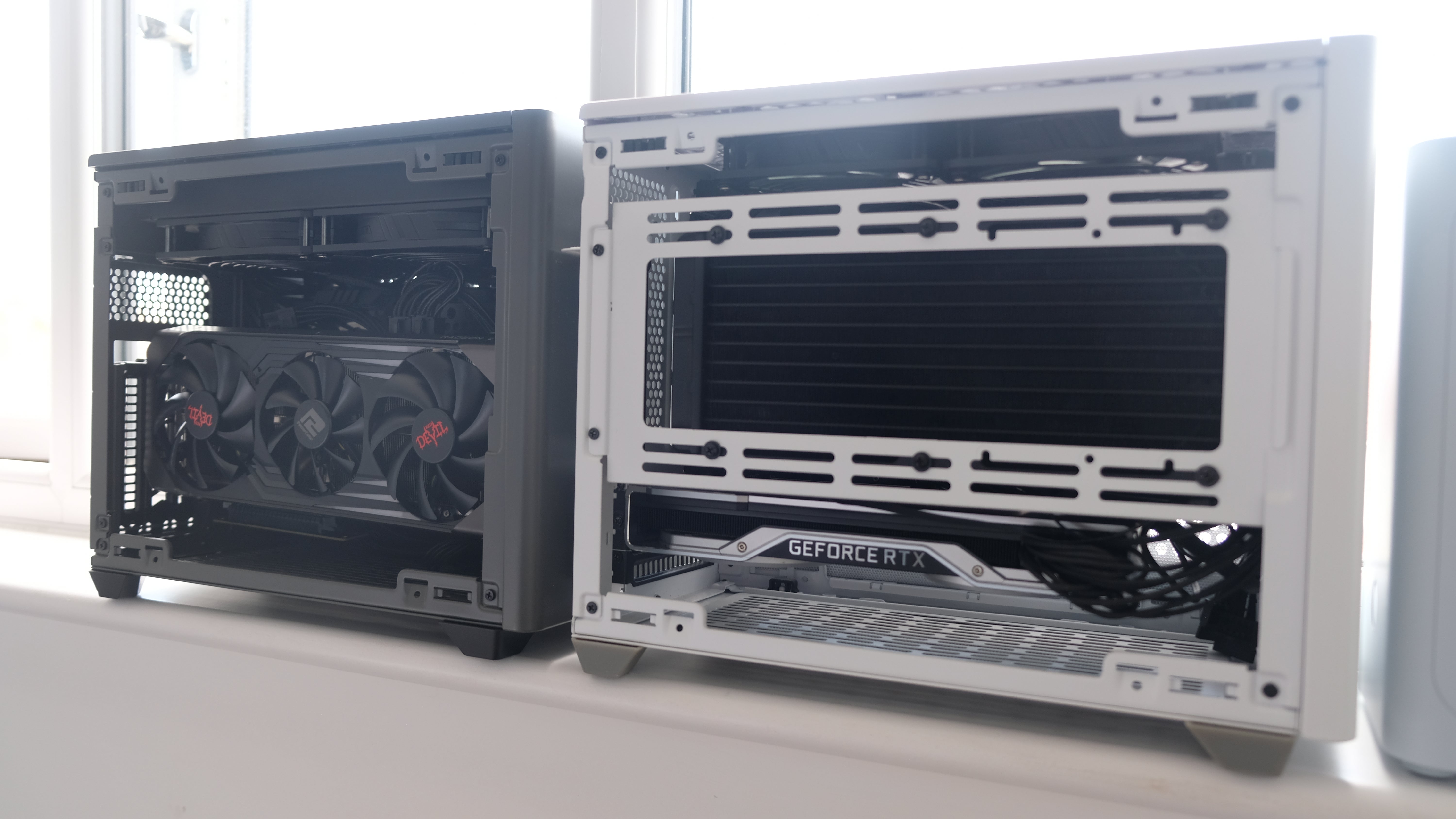 My build: I opted for a productivity-focused build in the ZX-1, combining a a 12-core Ryzen 9 7900X processor with a 240mm Asus AiO and an entry-level RTX 3050 graphics card. The combination isn't great for AAA gaming, but provides hardware acceleration for tasks like media encoding, video upscaling and noise removal. The PC's AiO is quiet when idle, but can become much louder when all cores and threads are being utilised. Still, there's little limiting CPU performance here, so encode times are identical to that of a full-size PC tower. Portability is obviously improved versus a larger build, but the aluminium frame makes this a relatively heavy PC despite its compact size. This was the hardest case of the four to build in, with extremely small gaps for the AiO cables to be routed through.