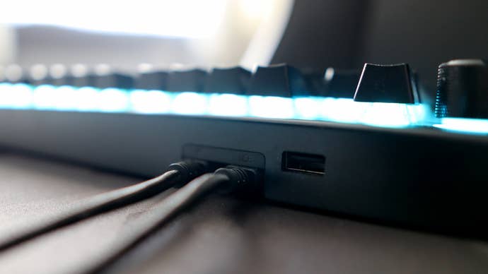 It is, quite frankly, a huge keyboard with that proper complement of keys, as well as a thick plastic base that has no deck flex to help the BlackWidow V4 Pro's proposition as a more premium option. You also get a comfortable wristrest for your troubles, and a thick braided cable with two USB-A ends - one for the keyboard, and one to power the USB-A port that's on the keyboard itself for plugging in other devices.