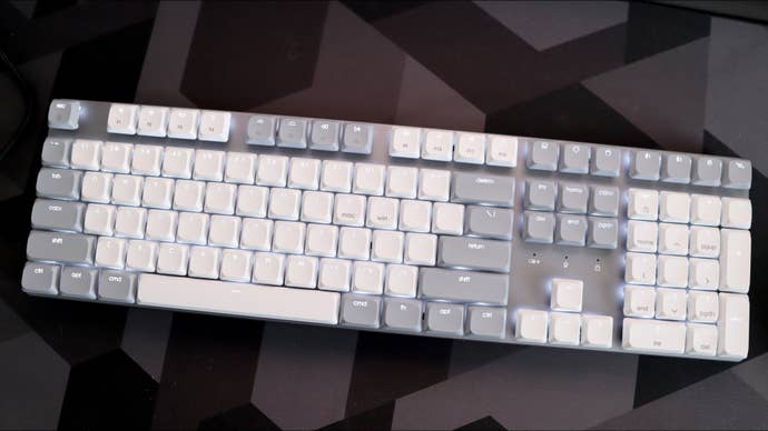 Construction-wise, it's a big slab of aluminium that has no deck flex, and whose pleasingly metallic finish works well with the white colourway of my sample - right on trend for modern peripherals that'll pair well with a white gaming PC if you've got one. It's also available in black if you'd prefer something a bit meaner, or less flashy I suppose. The actual look and feel of the MX 3.1, with that metal case and the bunched up full-size layout remind me of my old MX Board 6.0 that sat on my desk for years, and that's ten years old now.