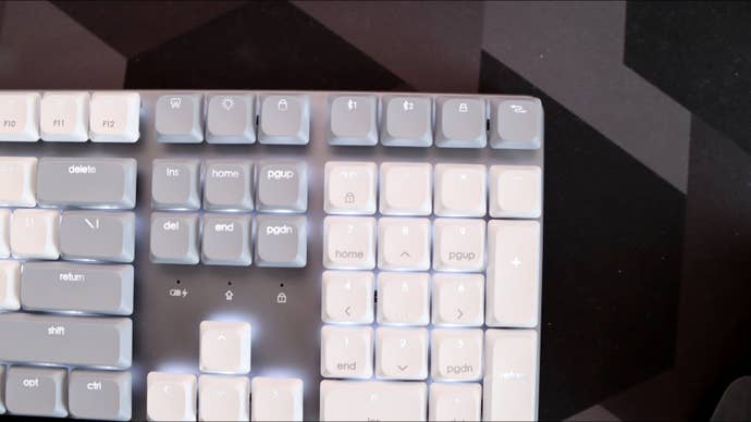 The full-size layout is convenient, providing access to everything from a number pad to a proper nav cluster with arrow keys, and a huge function row that stretches across the top of the entire board. Here you'll find Mac-specific functions for backlighting, brightness, media playback and more, as well as connectivity options in the top right corner.