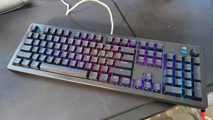 The Corsair K70 Core is another take on the "full-size gaming keyboard but make it 2025" theme pioneered by the Asus ROG Strix Scope 2 RX option above, this time with a multi-function control dial that can adjust volume or LED brightness, scroll vertically or horizontally, or zoom in and out. As with the Asus board, you can click in the dial to access a third function. These are a useful selection of controls, but switching between them requires pressing Fn+F12 and squinting to see which colour the F12 key briefly flashes - not exactly a stellar user experience in comparison to the permanently lit icons we saw elsewhere.