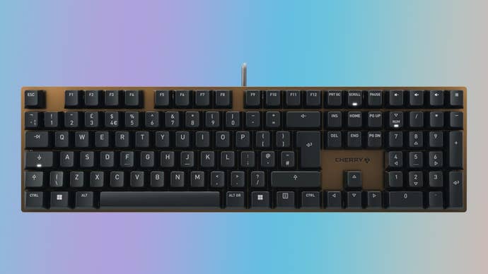 Elsewhere, this is a full-size layout with convenient extras such as integrated lock lights, media controls and a curved space bar for extra comfort in use. It's also plug and play with lightweight additional software for remapping the function row. There's an anodized metal plate for adding a touch of flair and structural rigidity, although the ABS keycaps and lack of backlighting present are a sign that Cherry has aggressively targeted a certain cost price. The colour options are also different based on region, with the UK's bronze/black replaced with a similarly stylish silver/white.