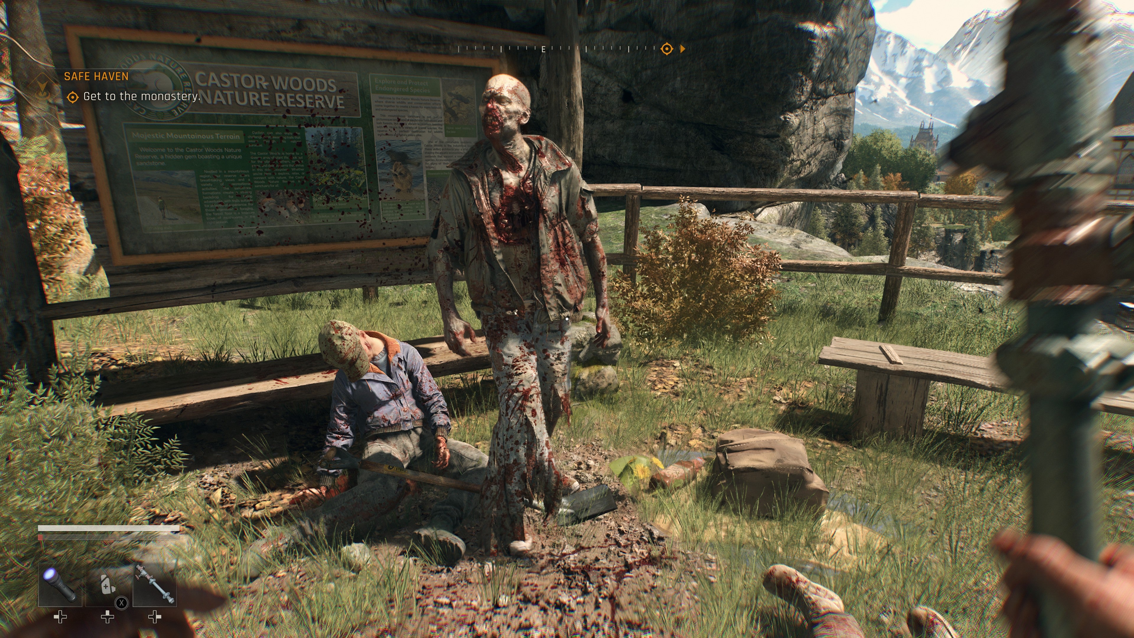 I start with all this, because there's a lot about Dying Light: The Beast's approach I do not like. For a game about smashing zombies in the face so hard their chins fly off, Techland's Very Serious Apocalypse seems determined to slap the joy out of proceedings as often as possible. But! From the moment I bashed open the research facility's improbably located side entrance and emerged blinking into the sunlight, The Beast had my attention. Instead of filth and urban squalor, this latest Dying Light goes fully rural, giving us the spruce forest sprawls and gleaming mountain vistas of the Swiss Alps. It's beautiful!
