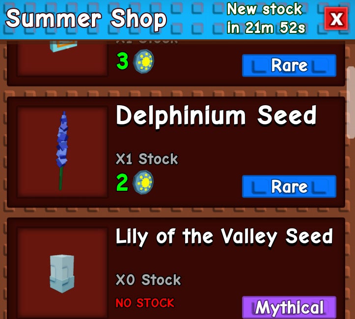 Delphinium seeds have a 'Rare' rarity. It is a single harvest crop, so you might want to save your Summer Coins for a multiple harvest seed like the Lily of the Valley.
