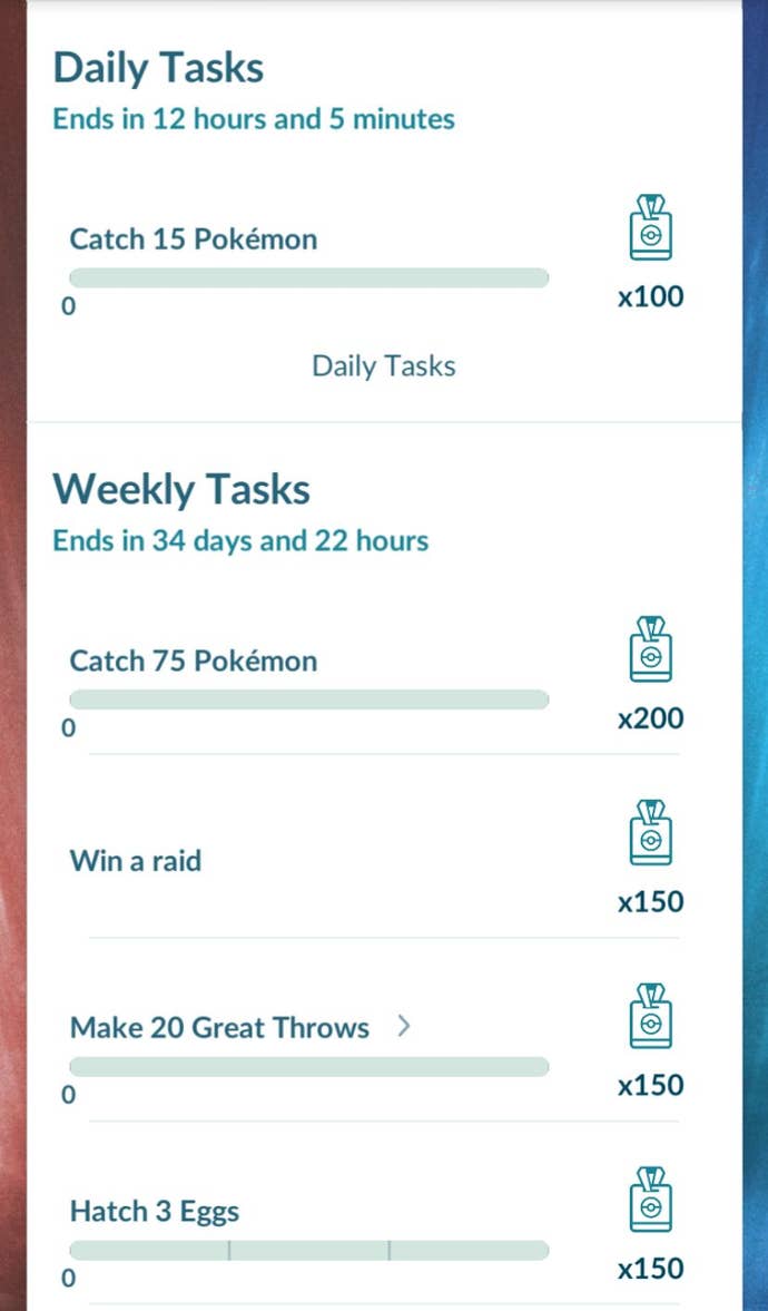 The second is by completing your Weekly Tasks. Despite the name, you'll actually have until the Go Pass expiry date to complete these tasks, with each week's tasks being added below the past week if it remain uncompleted. This means you can stack the Weekly Tasks and complete them all in the final week of the Go Pass' runtime if you so choose. There are seven Weekly Tasks in total and the amount of Points you can earn from completing one ranges from 100 to 200. An example of a 100 Point task is 'Spin 25 PokéStops or Gyms', while a 200 Point task is 'Catch 75 Pokémon'.