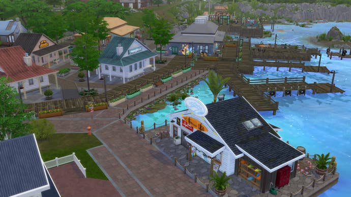 More than anything, though, I love the new Gibbi Point map, which has something of a New Zealand vibe. Over in Wonderwood Wilds, it's all dense forests, spouting geysers, and crystalline lakes - making it the perfect home for Sims who like their air fresh and the landscape rugged. And the nearby Camp Gibbi Gibbi means things are looking good for a Friday the 13th teen massacre this Halloween. Crystal Valley, meanwhile, is Gibbi Point's residential quarter, full of houses you might describe as cabin chic, and Jellyfish Junction is all about waterfront leisure, featuring quaint shops, an outdoor gym, an open air theatre, and more scattered along its picturesque wooden docks. And the water even glows at night!